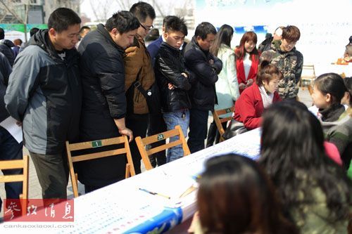 在中国就业市场上,农民工“用工荒与白领岗位短缺情况并存。图为3月12日,上海一家人才市场的求职者。
