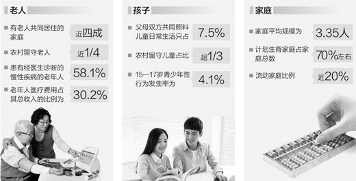 中国是世界上家庭数量最多的国家。调查显示,我国家庭平均规模为3.35人。家庭人口数量以2人或3人为主,2—3人的小型家庭(户)已经成为主流家庭,4—6人的家庭(户)所占比例已经低于小型家庭。家庭代数的构成以2代人为主,占50.6%;1代人居其次,占24.5%。