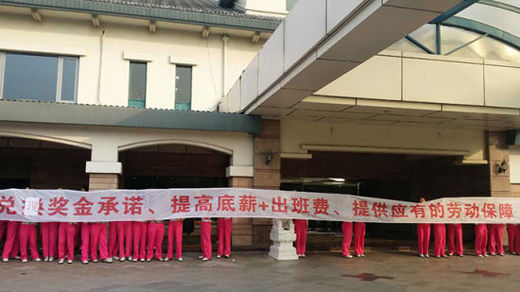 golf365网站记者听闻此事赶往现场。在现场,眼见汤臣球会已经拉起了“兑现奖金承诺、提高底薪+出班费、提供应有的劳动保障长长的横幅,球会大门被横幅所拦,近百名球童穿戴整齐在大门口席地而坐。球场的球童以及球场其他工作人员因为薪酬问题正在举行罢工,不再为前来打球的客人提供下场及拖包的服务,球场无法正常运营。据golf365网站记者了解,原来球场在近年间,由于管理层克扣员工薪酬,年前的奖金和赛事奖励也未能如承诺发放,还计划减少球童费,直接导致此次罢工的进行。球童表示,他们希望通过这样的行动,能够引起汤臣集团的关注,并兑现承诺、更换现有管理层。