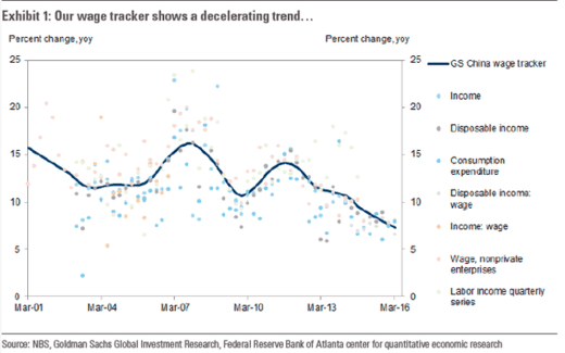 工资增速的放缓可能影响中国的消费增长。在高盛看来,这将拖累经济增长。