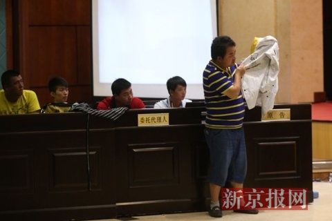 原告在法庭上展示工作服。新京报记者王贵彬摄