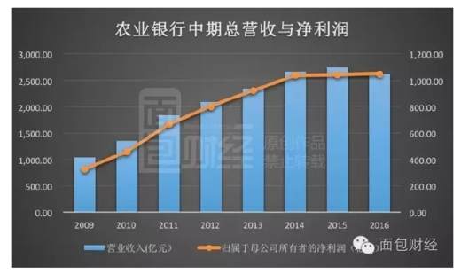 农业银行营收下滑与净利润增幅的放缓与利息收入的下降有很大的关系。上半年净利息收入为1989.57亿元,同比减少205.36亿元,减幅高达9.4%。值得一提的是,上半年农业银行的公司类贷款利息收入减少了287.14亿元,降幅达到18.0%。下图是面包财经(微信公众号ID:mbcaijing)根据财报数据绘制的农行近年来营收与利润走势图。