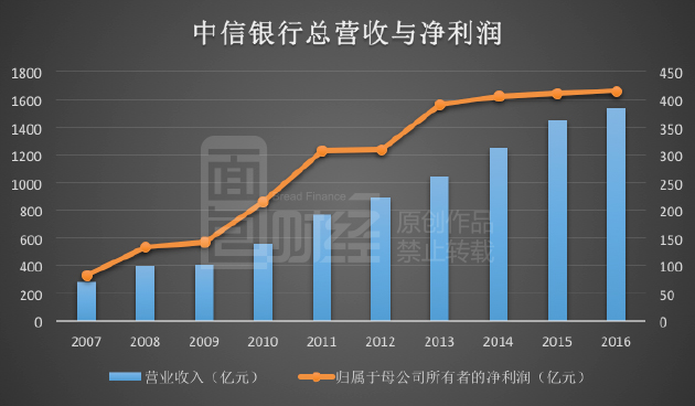 中信银行财报显示:2016年总营收为1537.81亿,同比上涨5.96%;净利润为416.29亿,同比仅上涨1.14%;净利润增速创下近四年来新低。在2013年时,中信银行净利润增速曾高达26.24%。下图为面包财经根据中信银行财报绘制的其总营收与净利润:
