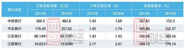事实上,已公布年报的A股4家上市银行中,只有江苏银行的不良贷款率持平,其它3家银行均出现上涨;而在拨备覆盖率方面,有三家银行下跌,中信银行和平安银行更是逼近150%的拨备覆盖率监管红线。