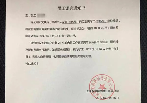 8月18日,Hi电员工周毛在钉钉上收到了一份公司发给他的《员工调岗通知书》。周毛原本在深圳负责线下拓展工作,月薪4000元,但突然而至的《通知书》要求他在24小时内自费前往位于新疆西北部的博乐市报到,且逾期三天未报到即被视为旷工、自动离职。