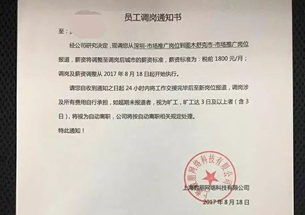 “实际上就是变相逼迫员工自动离职,说难听点就是连一个月的裁员补偿都不想给。发送了调岗通知书之后,也不管了,三天之后直接当你自动离职。”一位被“调岗”“的员工愤愤地对凤凰科技记者表示,公司甚至没有和他们进行面谈。