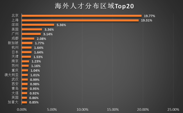 中国海外人才遍布全球,排名前20的分布区域是14个国内城市和国外6个国家。其中,人才分布占比最高的六个区域依次为北京、上海、深圳、美国、广州、成都,占比依次为19.77%、19.31%、5.36%、3.36%、3.14%、2.08%。