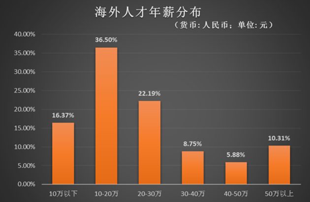 数据显示,年薪为10~20万的海外人才比例最高,为36.50%;其次是年薪为20~30万的海外人才,占比为22.19%。