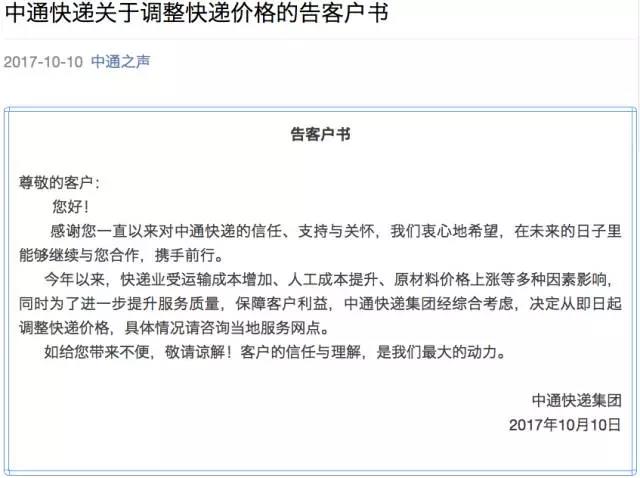 中通快递10月10日宣布,今年以来,快递业受运输成本增加、人工成本提升、原材料价格上涨等多种因素影响,同时为了进一步提升服务质量,保障客户利益,中通快递集团经综合考虑,决定从即日起调整快递价格,具体情况请咨询当地服务网点。