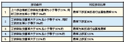 不同行业工伤风险类别分别对应的浮动档次怎样确定?《办法》规定根据不同行业的工伤风险程度,按照《国民经济行业分类》对行业的划分,将行业工伤风险类别划分为一类至八类。一类行业浮动分为三个档次,即在基准费率0.2%的基础上,可向上浮动至120%、150%;二类至八类行业浮动分为五个档次,即在基准费率0.4%、0.7%、0.9%、1.1%、1.3%、1.6%、1.9%的基础上,可分别向上浮动至120%、150%或向下浮动至80%、50%。比如上个浮动周期工伤保险支缴率大于20%且小于等于40%,同时工伤发生率小于等于3‰的,费率下浮至其所在行业基准费率的80%(具体见图表)。
