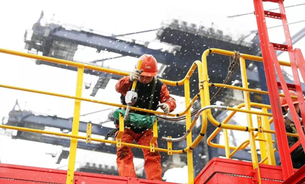 图说:振华重工长兴生产基地工作人员对岸桥进行调试。网络图