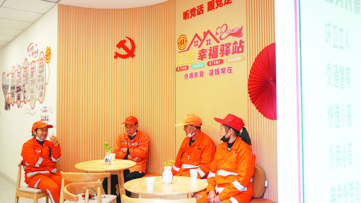 环卫工人正在工会幸福驿站休息。