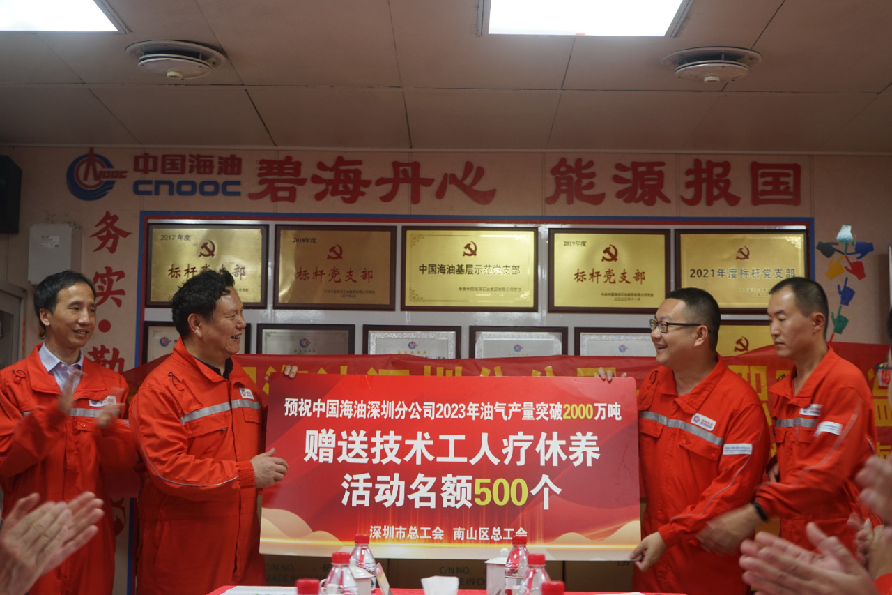 在中海石油(中国)有限公司深圳分公司(以下简称中国海油深圳分公司)年产油气继续突破2000万吨的关键时间节点,11月24日,深圳市总工会、市工信局、南山区联合慰问该公司海上作业职工,将党和政府的关怀与温暖送到一线职工身边。深圳市人大常委会副主任、市总工会主席彭海斌,南山区委书记、区长黄湘岳,市工信局副局长肖祖平等参加慰问活动。